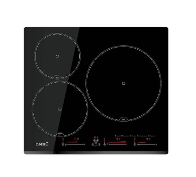 3 Indukciós főzőzóna, MACH2 indukciós technológia, Touch Control érintővezérlés, 9 fokozat, 1 db 30 cm-es, 1 db 23 cm-es és 1 db 18 cm-es főzőzóna, minden főzőzóna BOOSTER funkcióval, 3 főzési funkció: olvasztás (45-55ºC), melegítés, melegen tartás (65-70 ºC), forralás (85-95ºC), gyerekzár, időzítő, maradékhő kijelzés, Quick-Fix system, teljesítmény: 7,1 kW