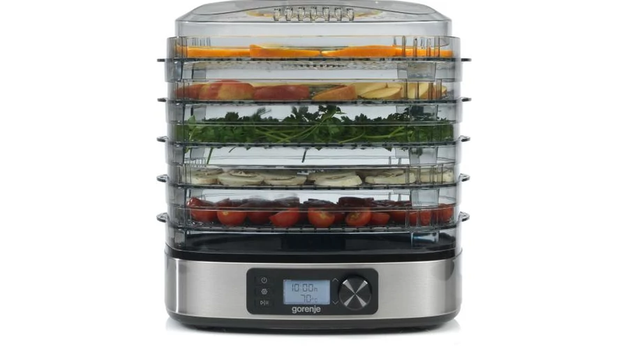 GYÜMÖLCSASZALÓ Teljesítmény: 380 W, 30-75 °C, 5 db 32 cm átmérőjű és változtatható magasságú tálca, csúszásmentes talp, digitális kijelző, 0,5-36 órás időzítés, inox-átlátszó