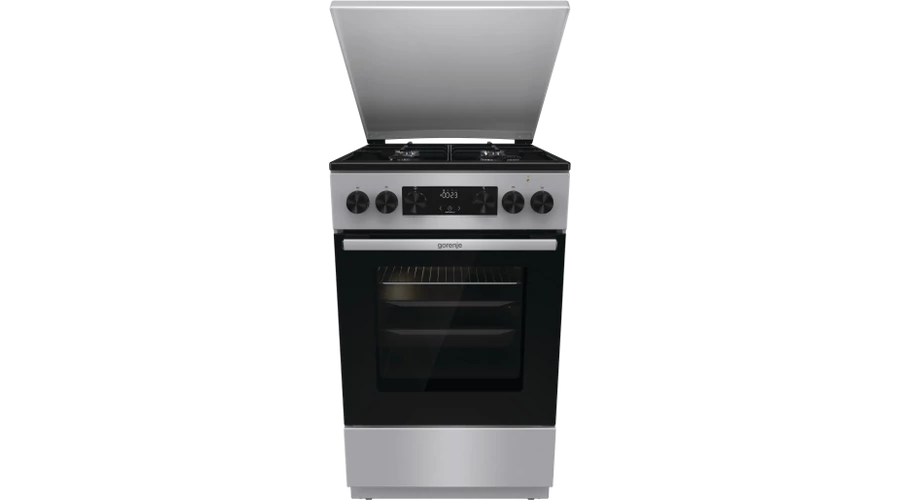 GORENJE KOMBINÁLT TŰZHELY, Kamra űrtartalma: 70l, HomeMadePlus kemence formájú sütőkamra, Méretek: (Ma x Szé x Mé): 85/50/59,4cm, "A" energiaosztály, max. hőmérséklet 275°C, 4 gázégő,elektromos multifunkciós sütő ExtraSteam GŐZFUNKCIÓval, gyors felfűtés, Frozen Bake - fagyasztott termékek sütése, Pizza, AirFry funkció stb., GentleClose lassú ajtózáródás, AquaClean öntisztítás, Timer - beállítható sütési idő, tekerő- és érintőgombokkal vezérelhető sütő, SilverMatte zománc, egykezes elektr.szikragyújtás, TELESZKÓPOS SÜTŐSÍN - egy szintes, öntöttvas edénytartó rács, mid zománcozott edénytartó rács, sütőrács, mély- és lapos tepsi, fém tető, INOX szín