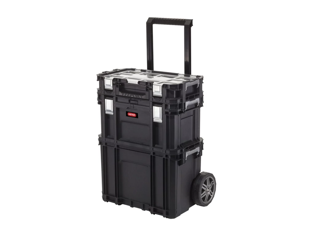 A Connect gurulós szerszámosláda szett tökéletes választás minden hobbi-barkácsoló és profi számára, aki szeretné egy helyen tudni az összes szükséges szerszámát. A szett egy rendszerezőből, egy szerszámosládából és egy kerekes kocsiból áll. A tartós polkarbonát anyagból készült, 8 kisebb és 2 nagyobb rekeszből álló rendszerező teteje átlátszó, így a benne tárolt szerszámok és alkatrészek mindig láthatók lesznek. A tágas szerszámosláda ideális nagyobb szerszámok tárolásához, helyet kapott benne egy kivehető tálca is a legfontosabb szerszámoknak. A 7"-os kerekekkel és teleszkópos fogantyúval felszerelt kocsi lehetővé teszi a szerszámok szállítását egyenetlen terepen is. A rendszer elemei fém csatok segítségével zárhatók, melyek garantálják a biztonságos szállítást. A Connect termékcsalád termékeivel kompatibilis, így az igényeknek megfelelően bővíthető.