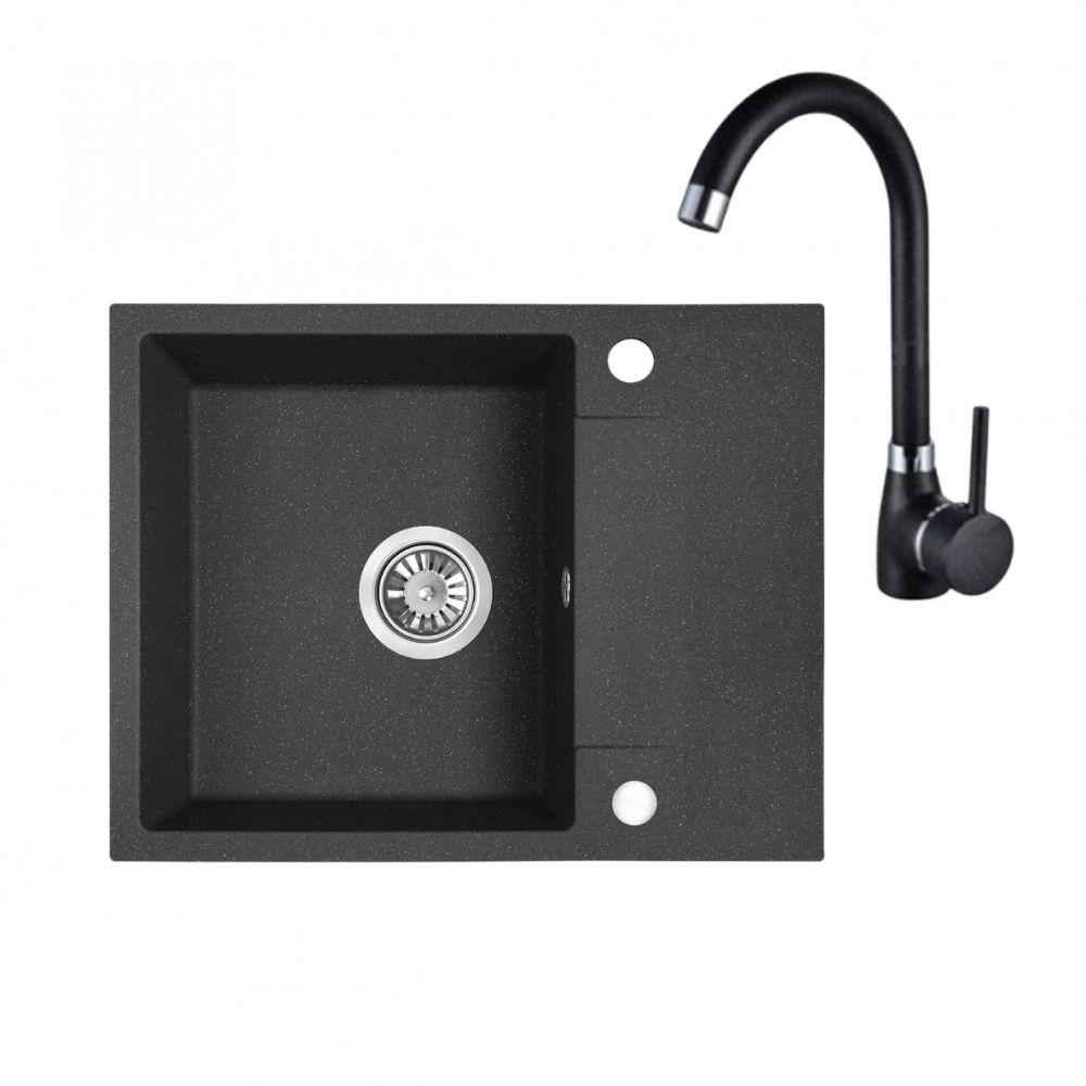 Laveo RAB MINI szemcsés fekete szett álló csappal, helytakarékos szifonnal, csaplyuktakaró dugóval