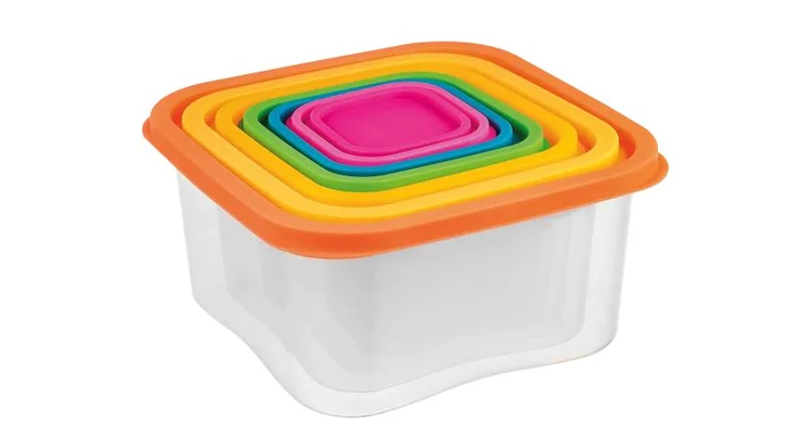- A készlet 7 négyzet alakú tartályt és színes, szorosan záródó fedeleket tartalmaz